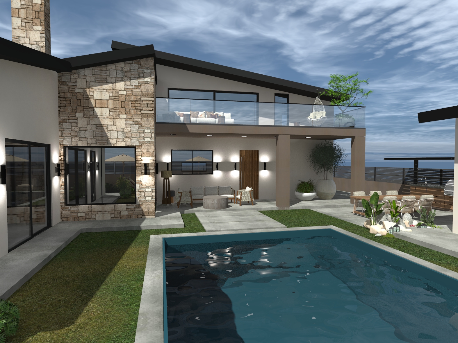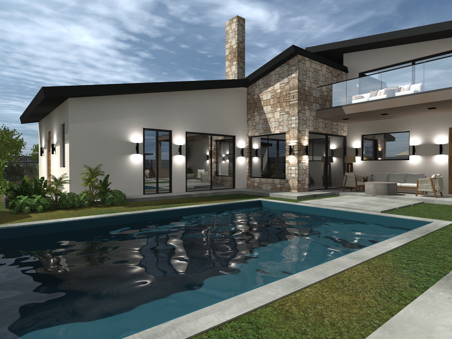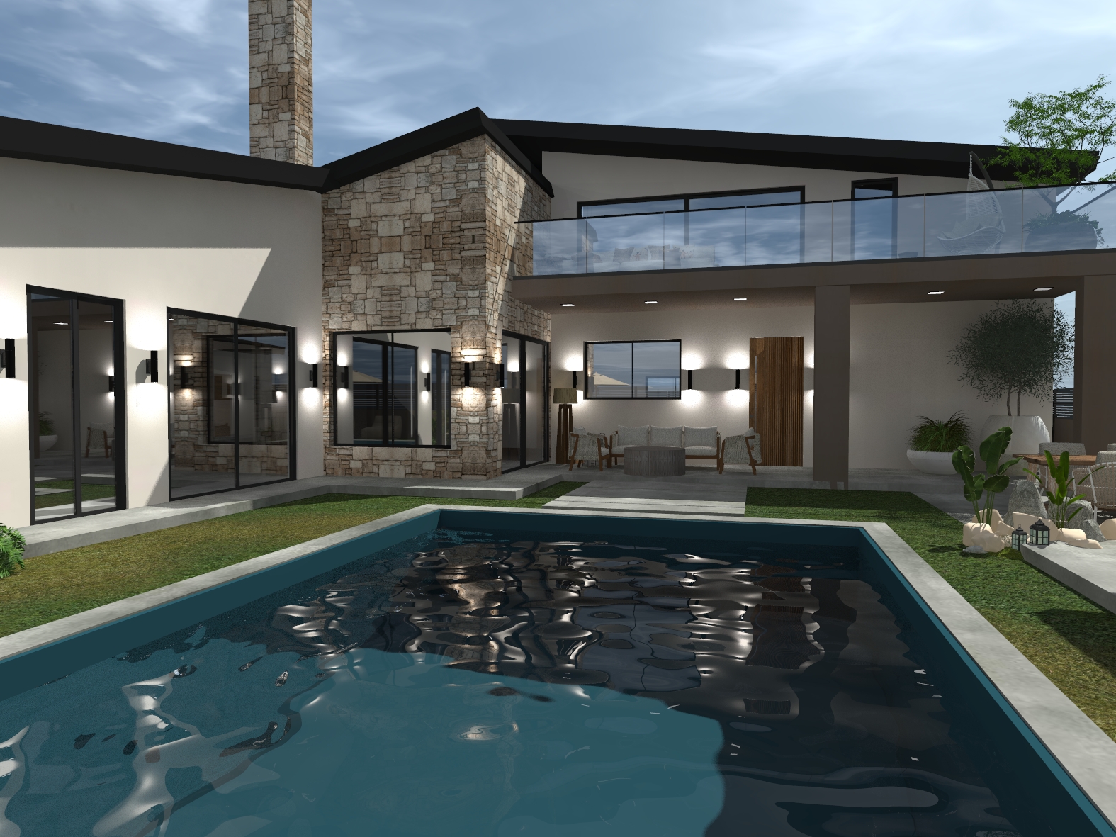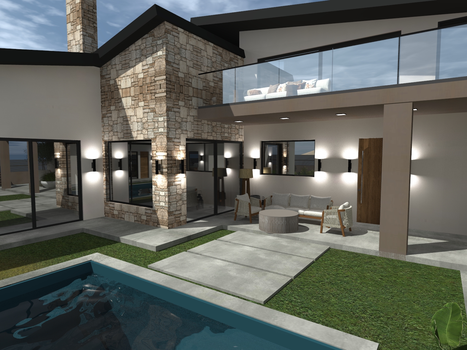 Οικιστική κατασκευή η οποία οργανώνεται γύρω από την πισίνα και τους χώρους εξωτερικής διαβίωσης, δημιουργώντας ένα περιβάλλον ιδανικό για χαλάρωση και φιλοξενία.