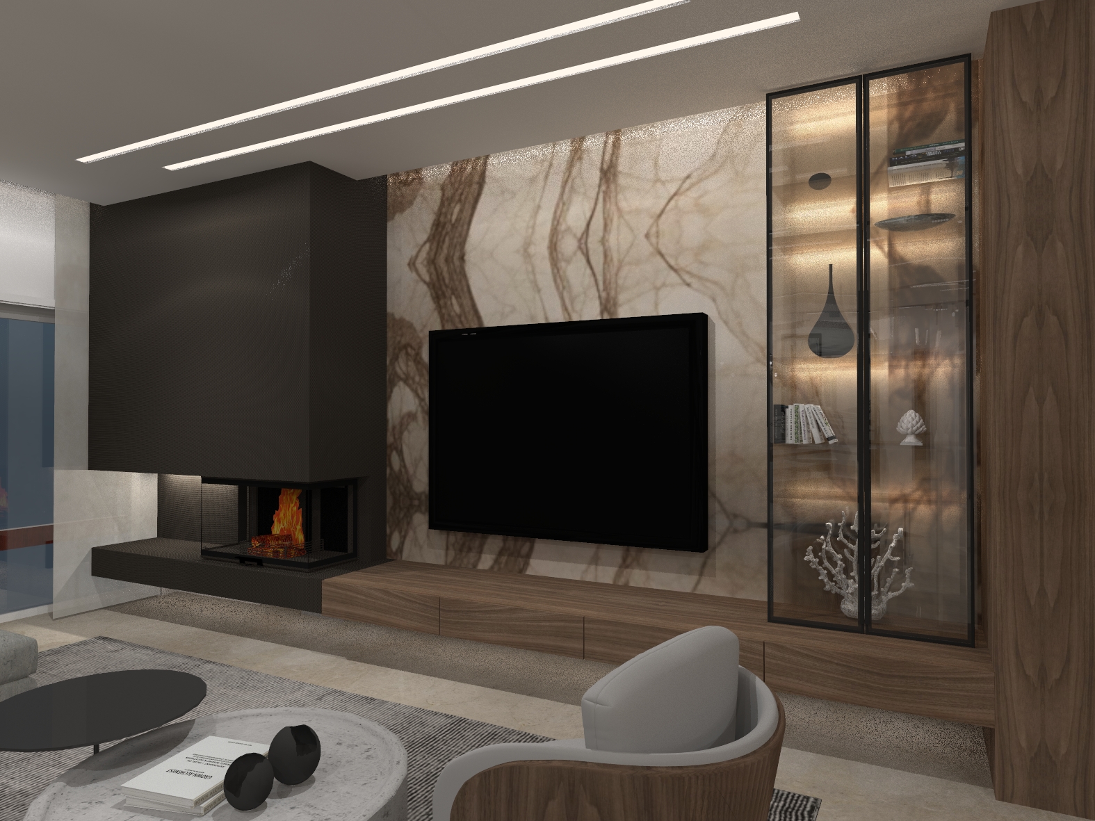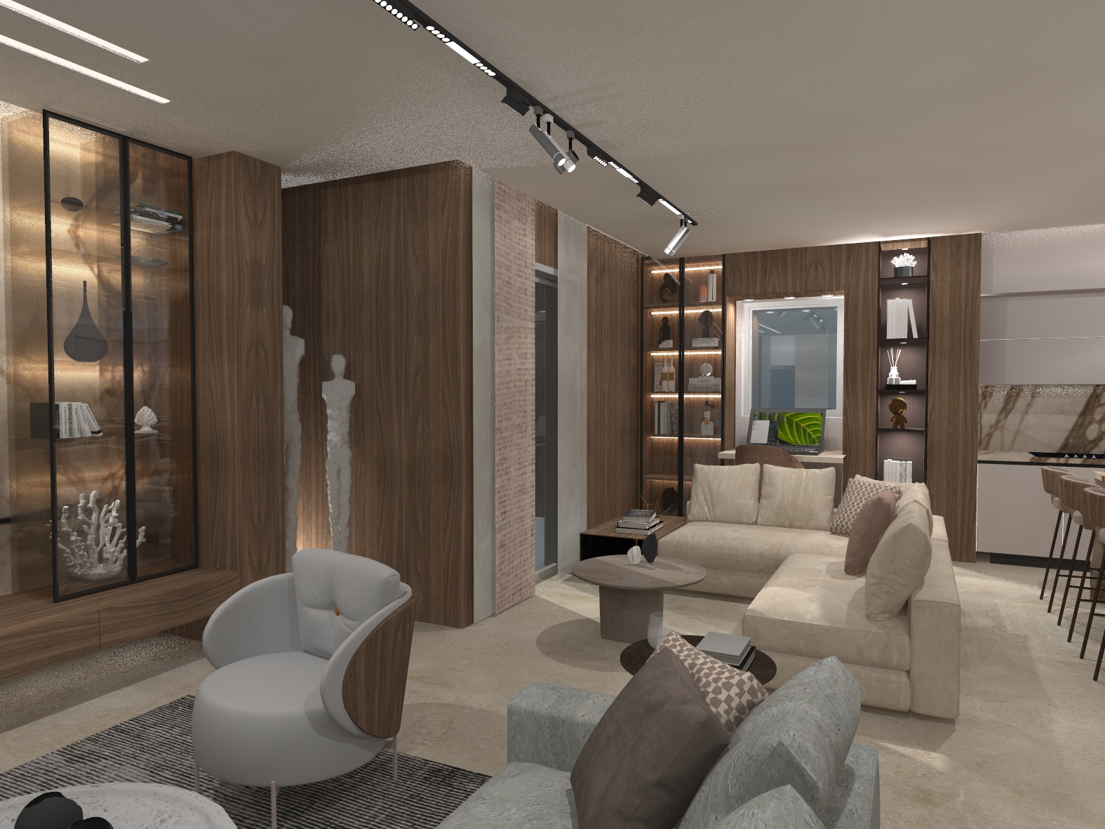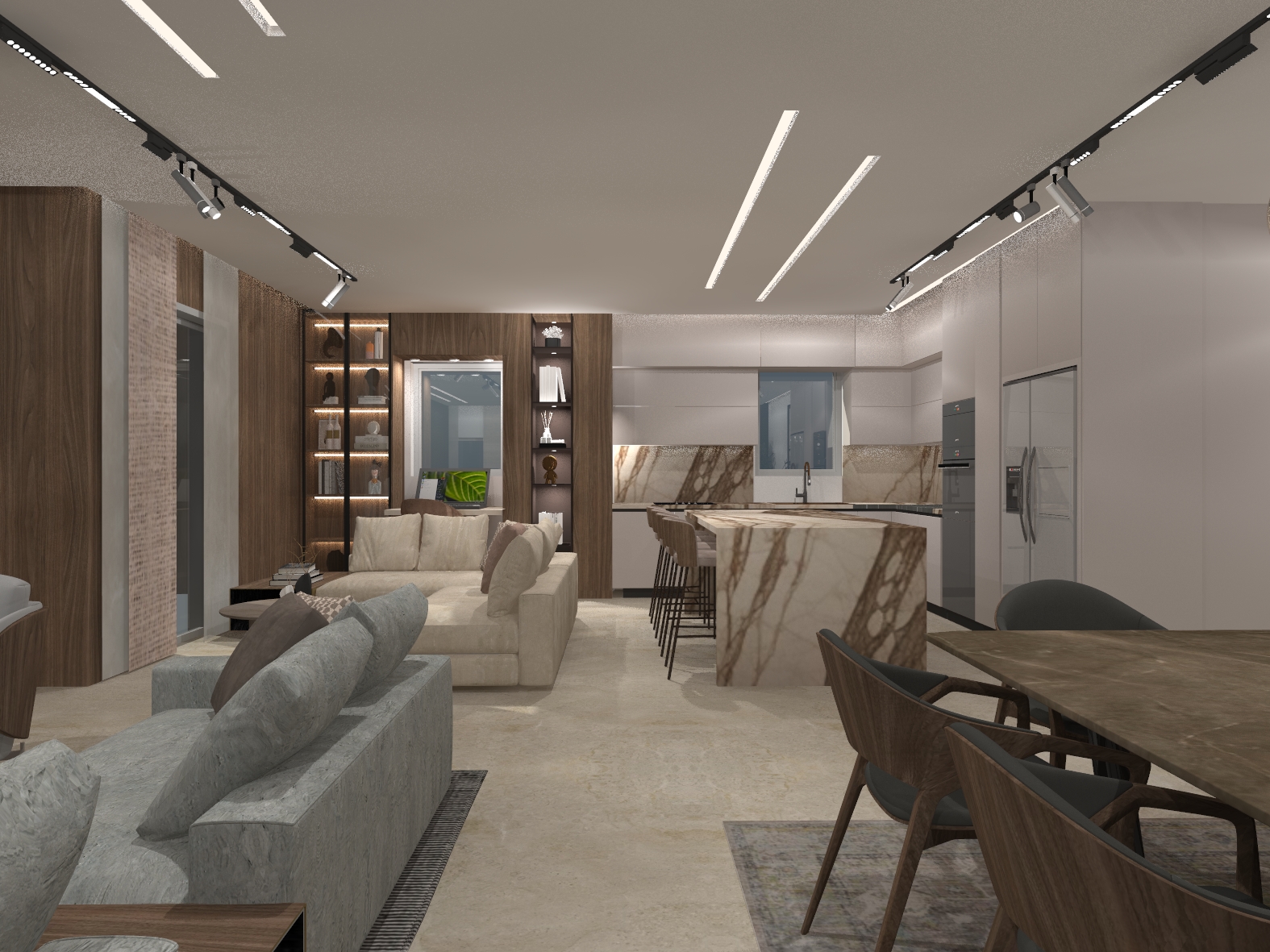 Σύγχρονη κατοικία με ενιαίο χώρο καθιστικού–κουζίνας, επενδύσεις μαρμάρου και ξύλου και ειδικές κατασκευές επίπλων. Ο γραμμικός και κρυφός φωτισμός αναδεικνύει τον minimal σχεδιασμό και τη σύγχρονη αισθητική του χώρου.