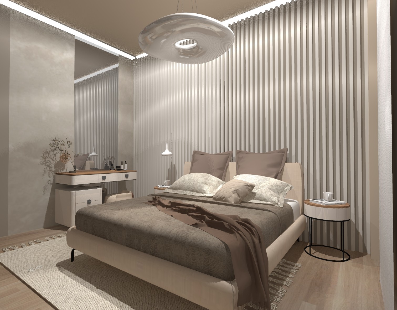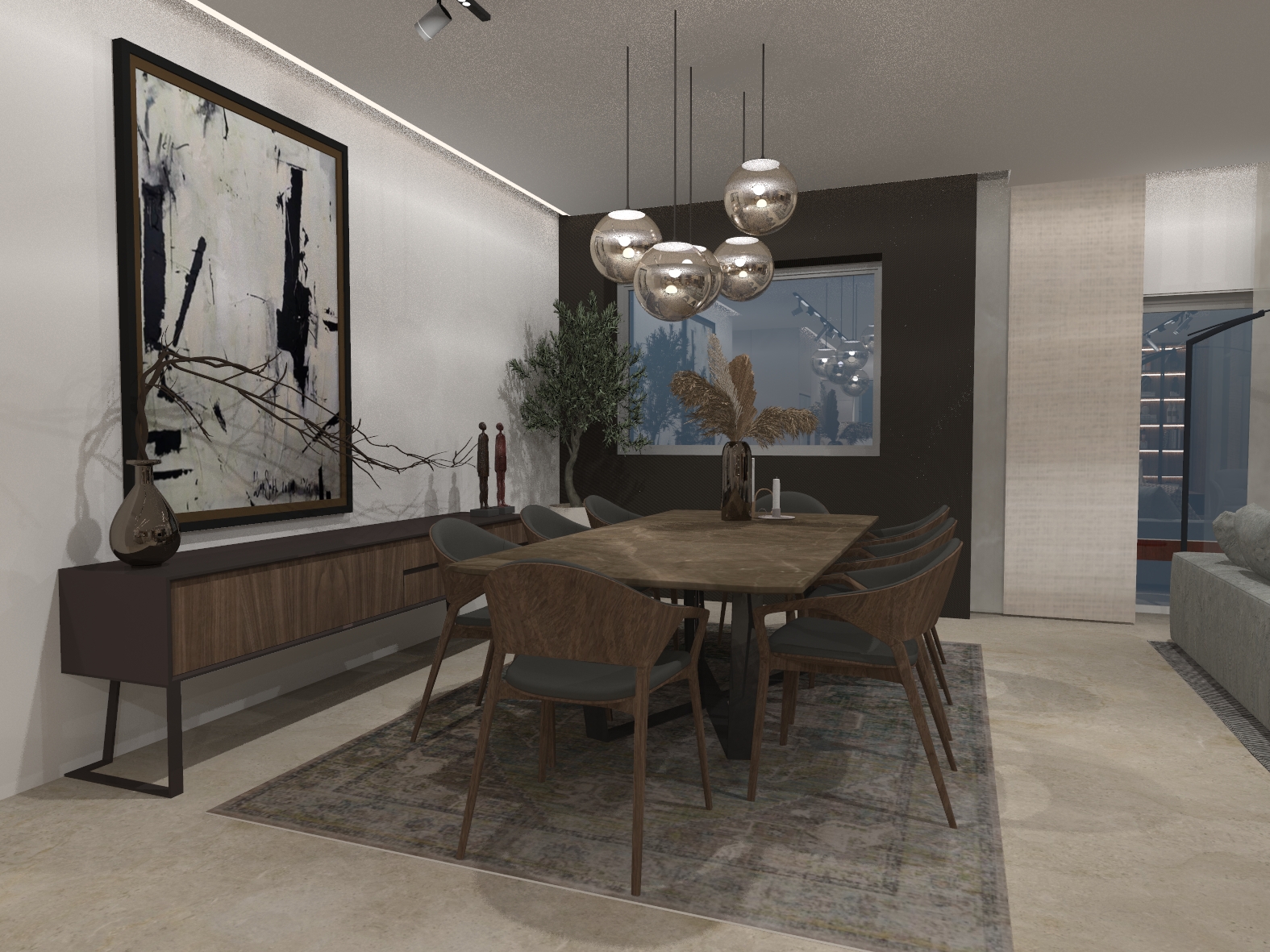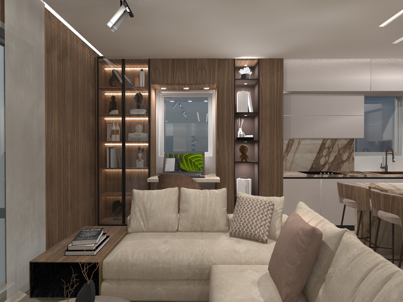 Σύγχρονη κατοικία με ενιαίο χώρο καθιστικού–κουζίνας, επενδύσεις μαρμάρου και ξύλου και ειδικές κατασκευές επίπλων. Ο γραμμικός και κρυφός φωτισμός αναδεικνύει τον minimal σχεδιασμό και τη σύγχρονη αισθητική του χώρου.