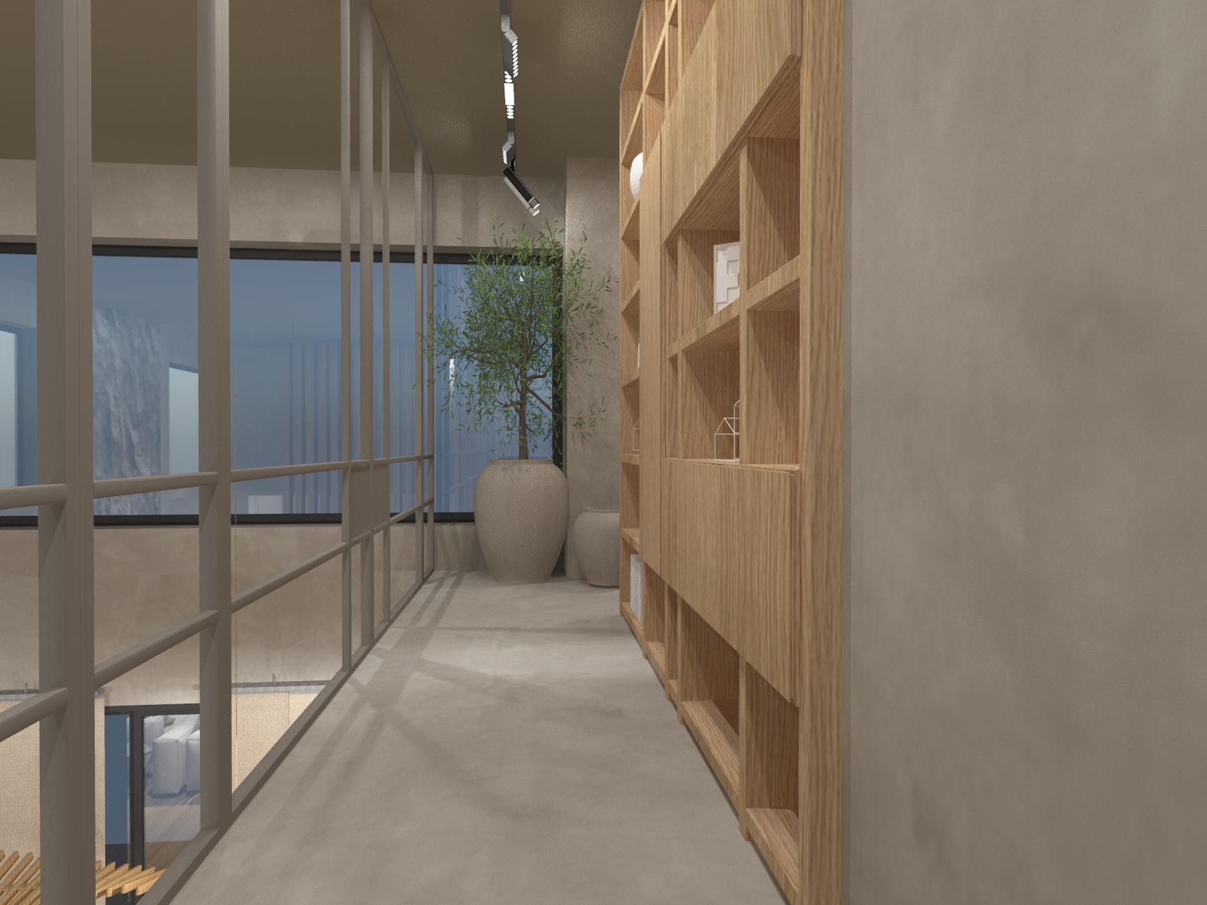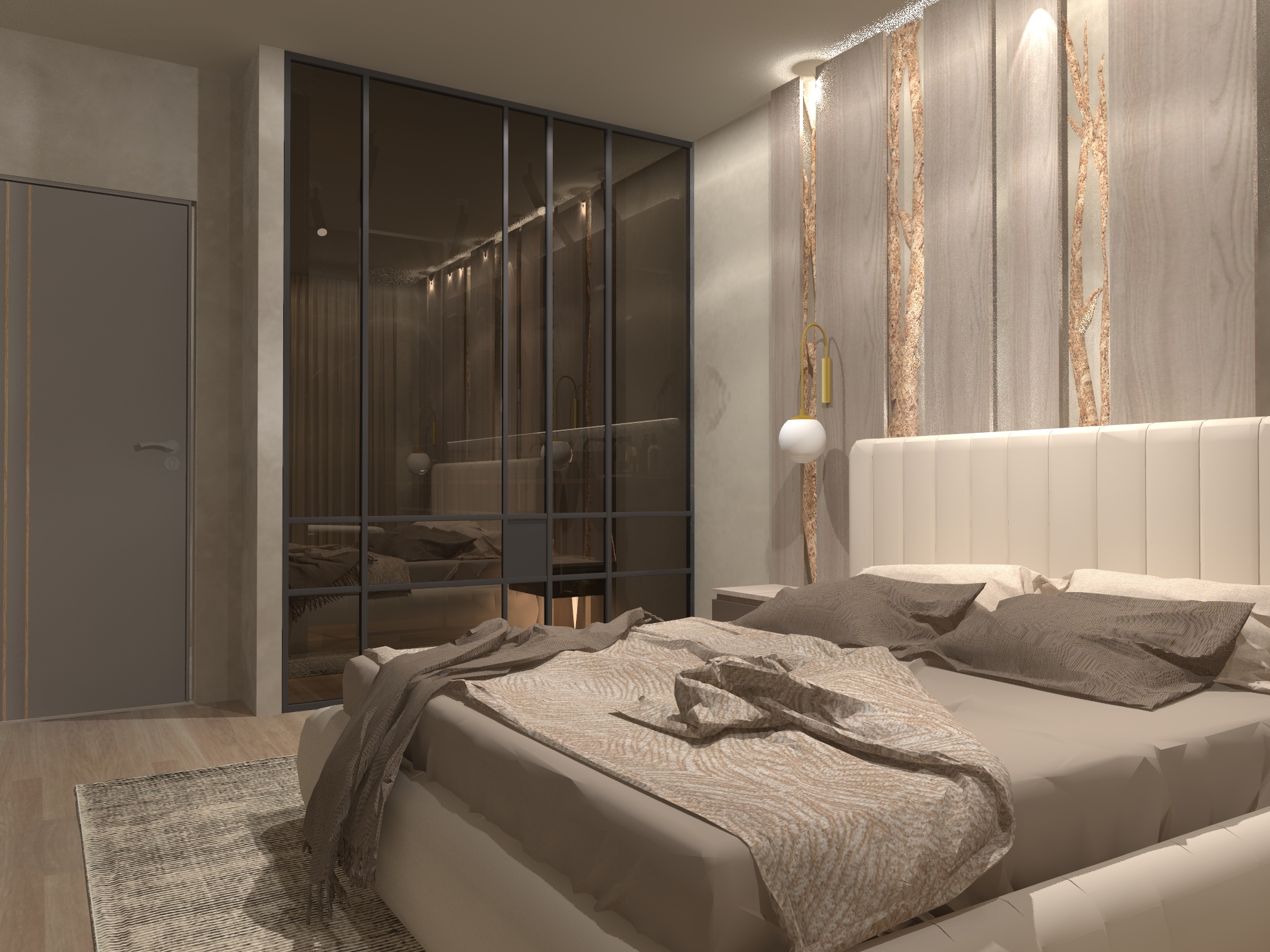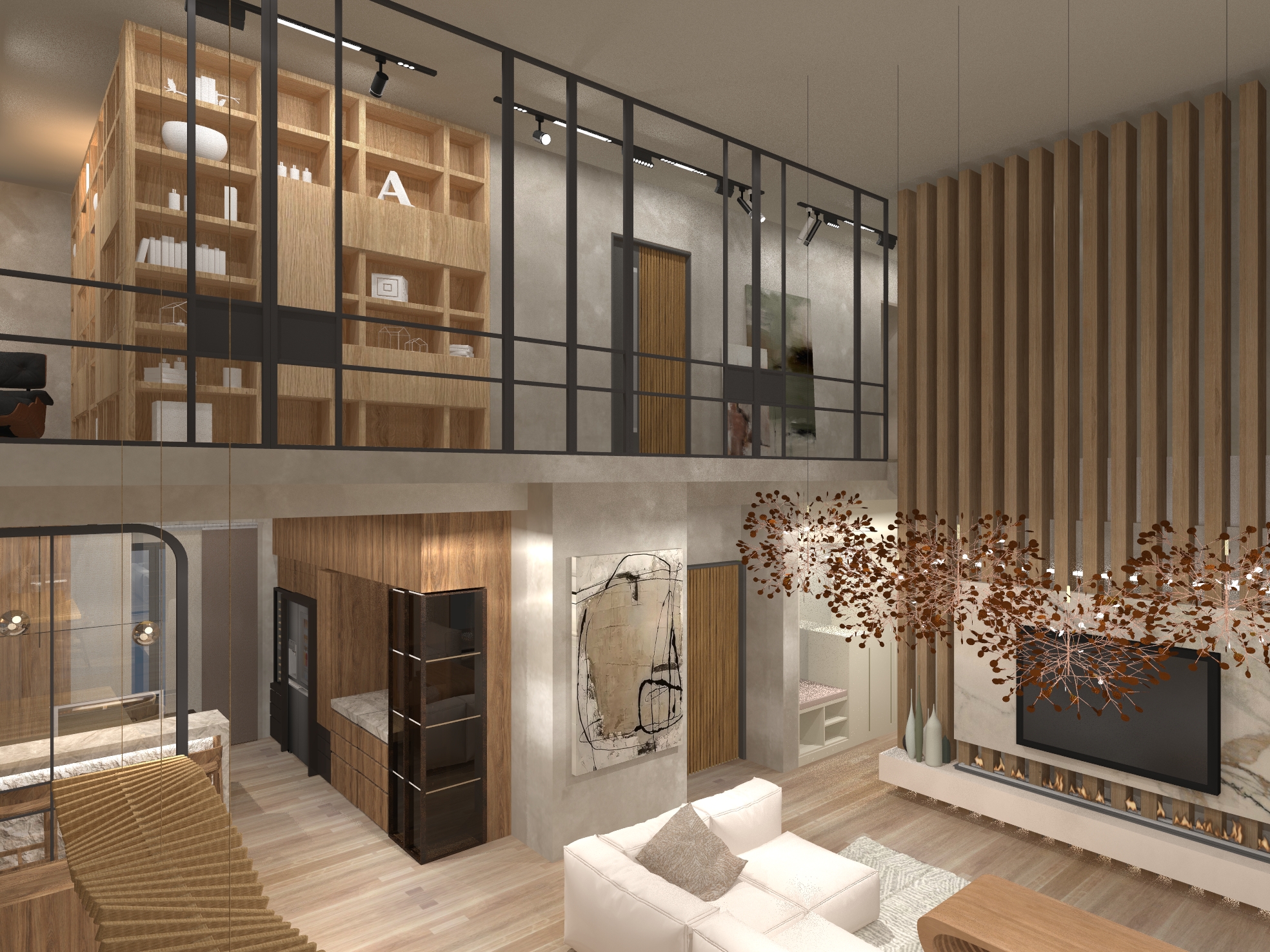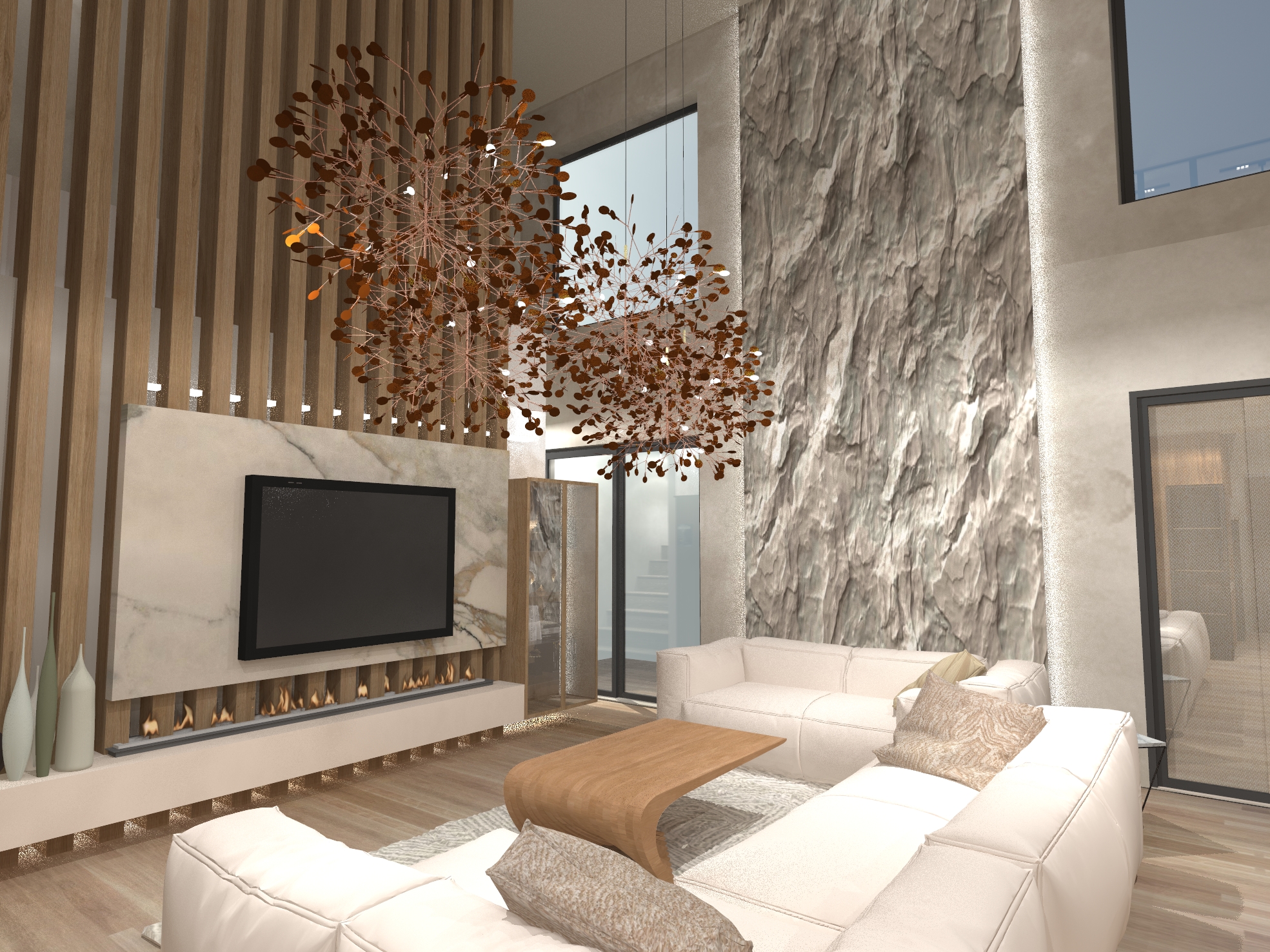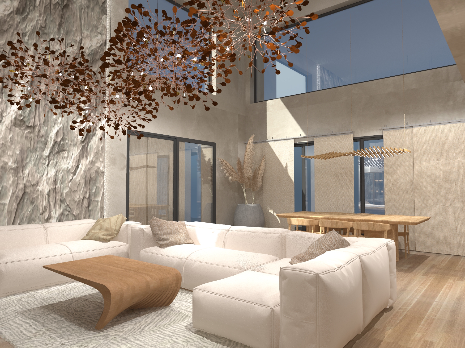 Σύγχρονη κατοικία με διώροφο χώρο καθιστικού, μεγάλα υαλοστάσια και υλικά φυσικής αισθητικής όπως ξύλο, πέτρα και μεταλλικές κατασκευές. Η εσωτερική διαμόρφωση συνδυάζει minimal αρχιτεκτονική, ενσωματωμένο φωτισμό και custom κατασκευές επίπλων, δημιουργώντας έναν κομψό και λειτουργικό χώρο διαβίωσης.