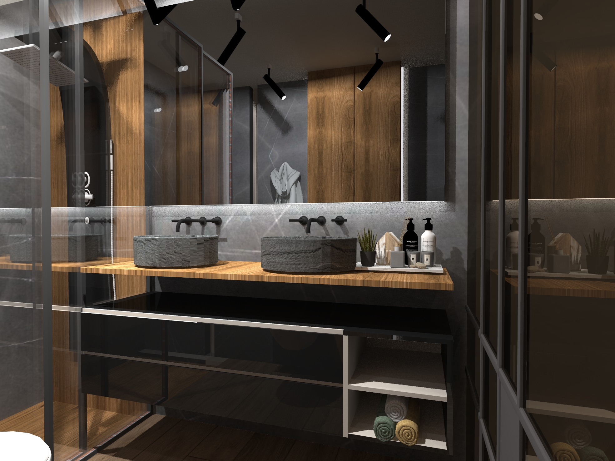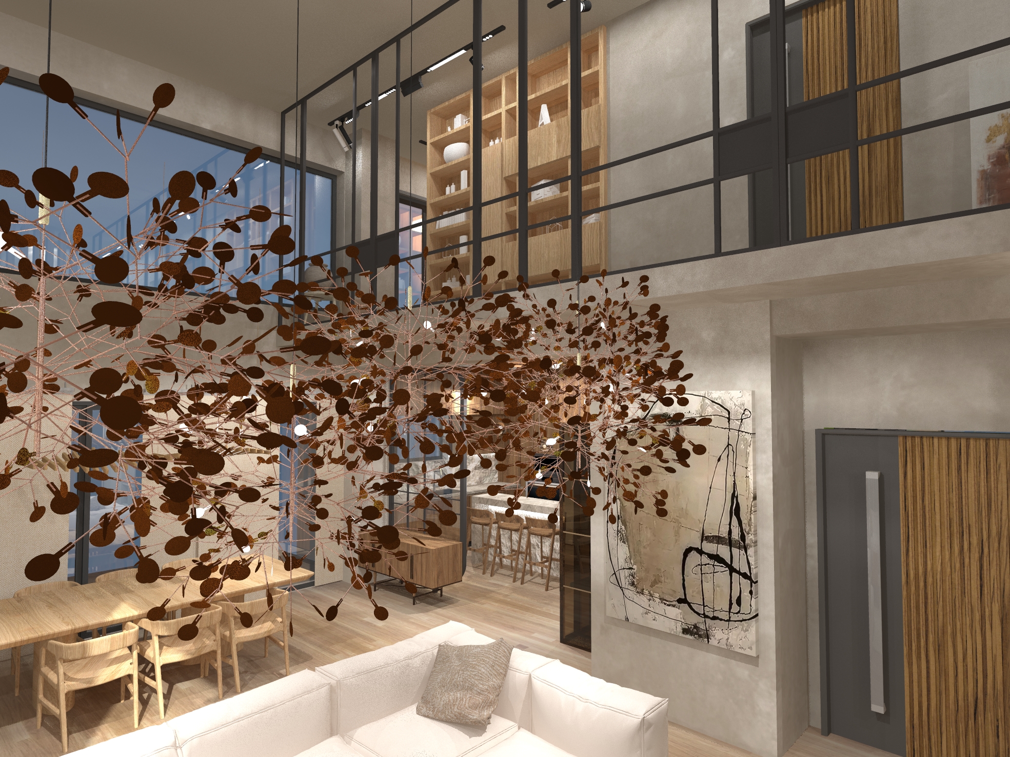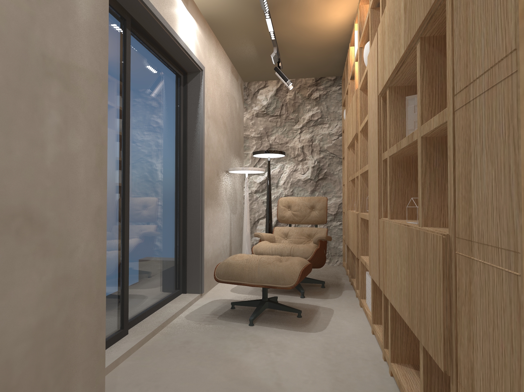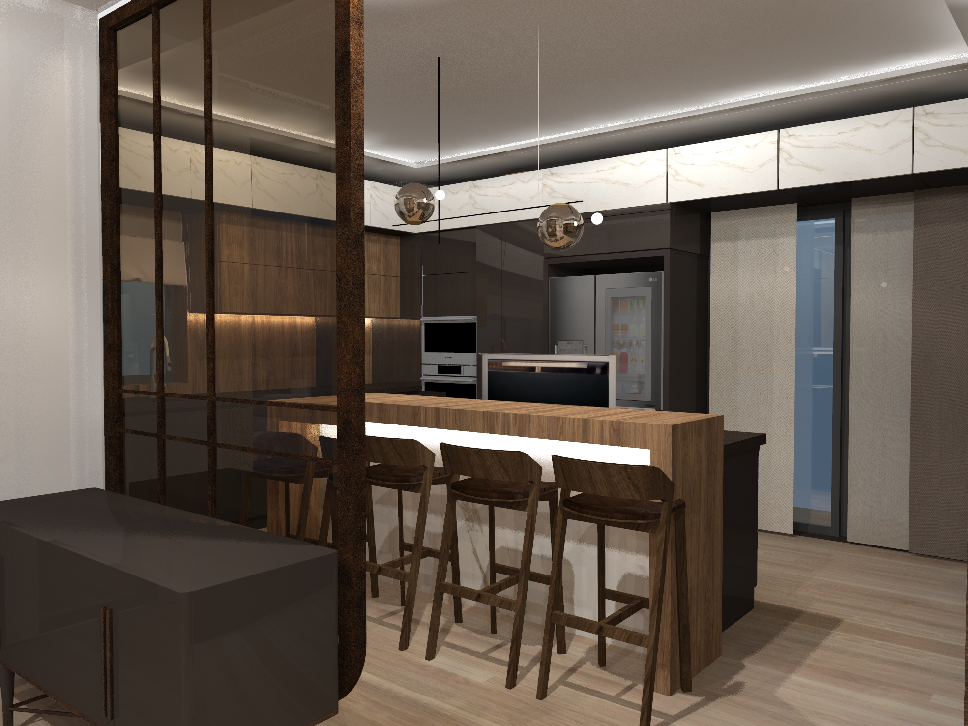 Σύγχρονη κατοικία με διώροφο χώρο καθιστικού, μεγάλα υαλοστάσια και υλικά φυσικής αισθητικής όπως ξύλο, πέτρα και μεταλλικές κατασκευές. Η εσωτερική διαμόρφωση συνδυάζει minimal αρχιτεκτονική, ενσωματωμένο φωτισμό και custom κατασκευές επίπλων, δημιουργώντας έναν κομψό και λειτουργικό χώρο διαβίωσης.