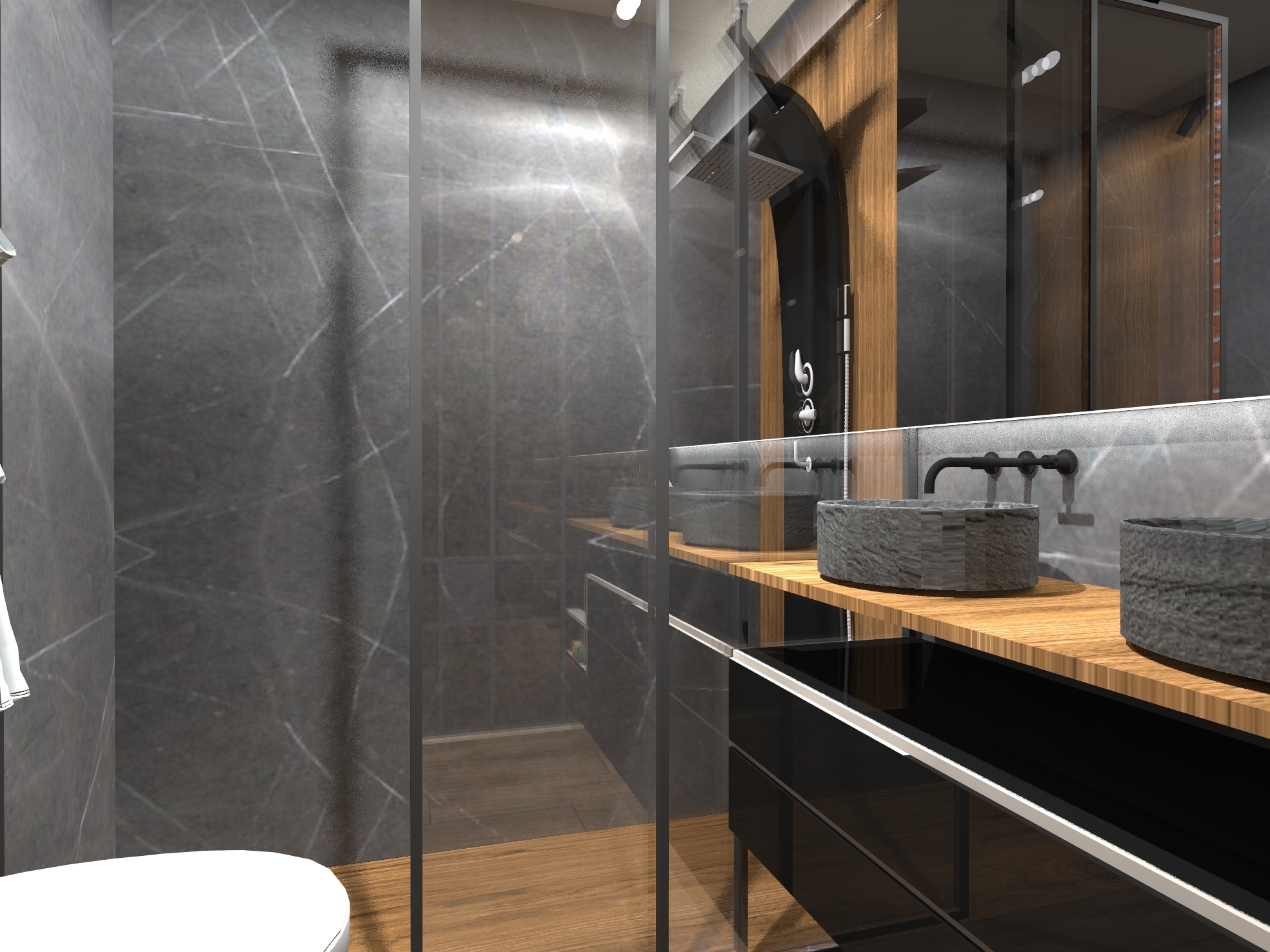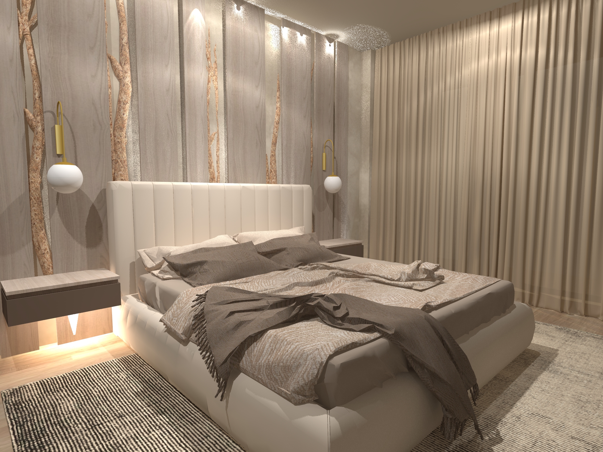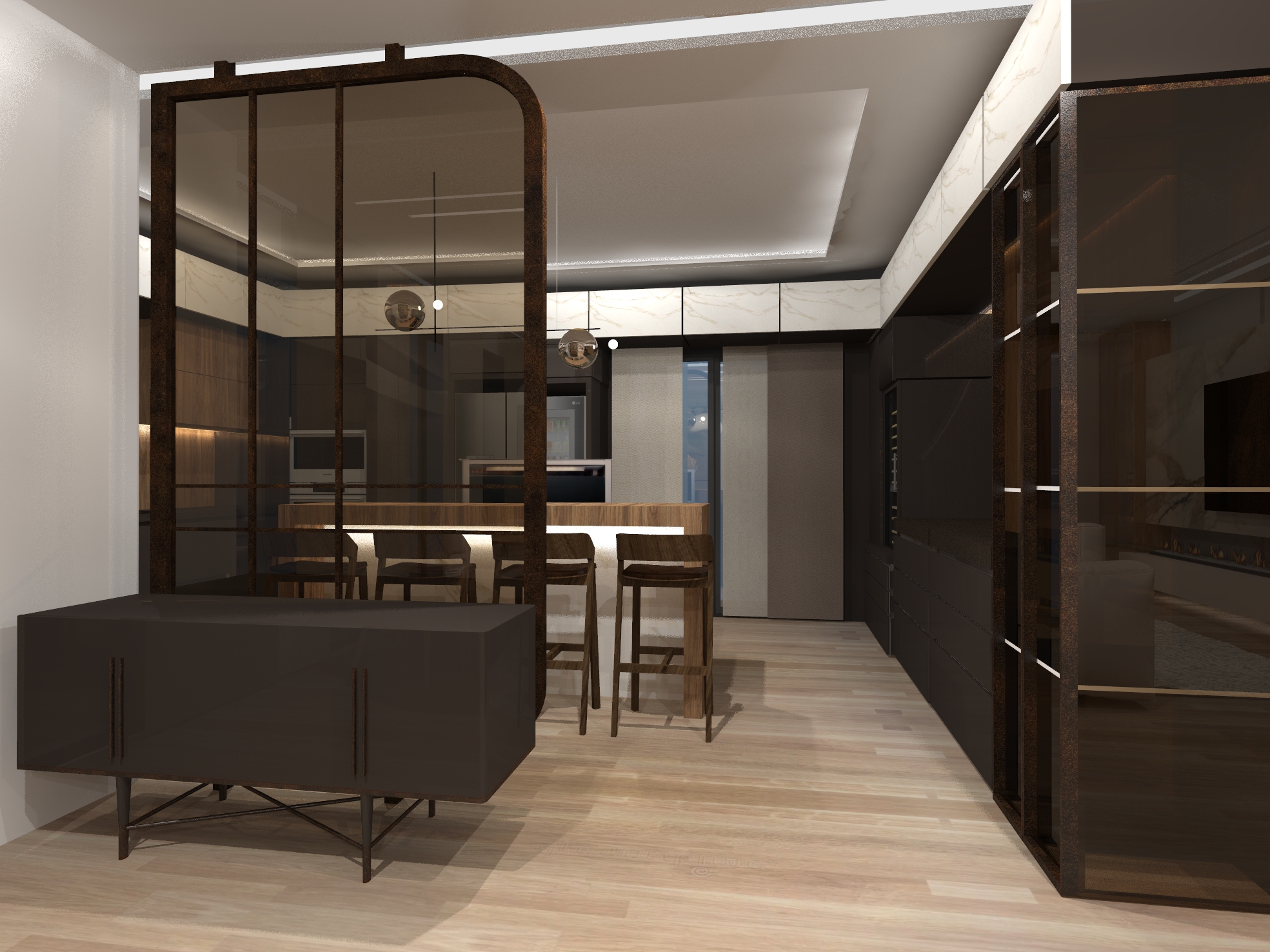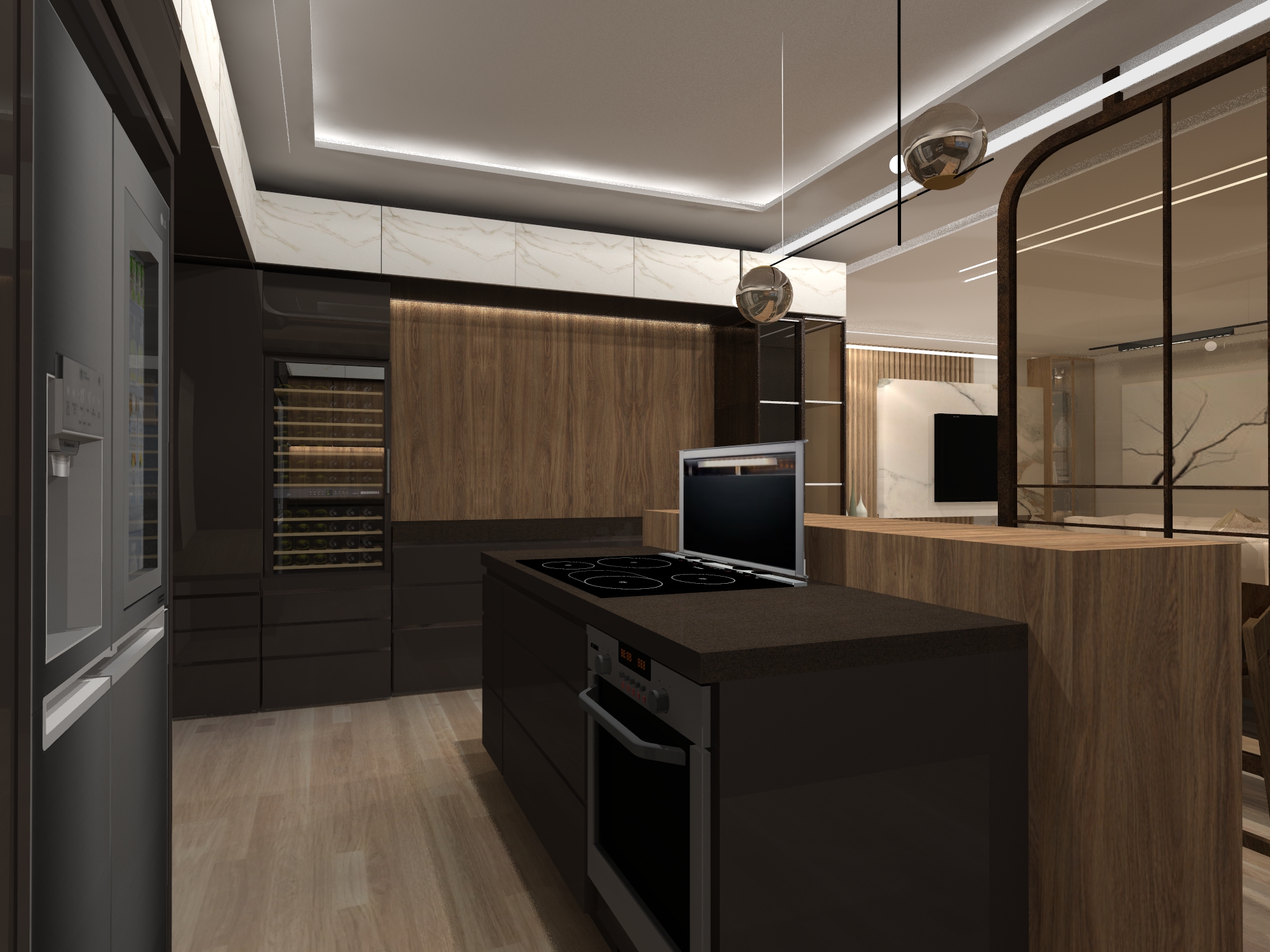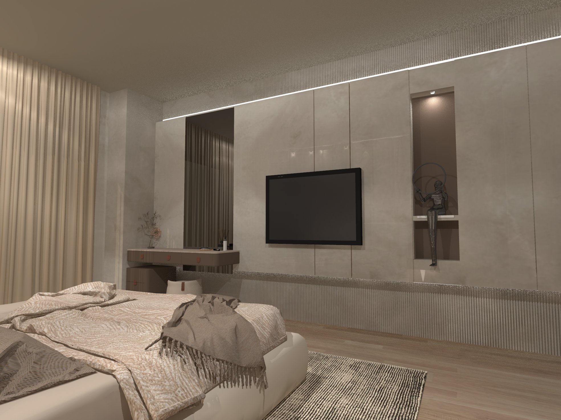 Σύγχρονη κατοικία με διώροφο χώρο καθιστικού, μεγάλα υαλοστάσια και υλικά φυσικής αισθητικής όπως ξύλο, πέτρα και μεταλλικές κατασκευές. Η εσωτερική διαμόρφωση συνδυάζει minimal αρχιτεκτονική, ενσωματωμένο φωτισμό και custom κατασκευές επίπλων, δημιουργώντας έναν κομψό και λειτουργικό χώρο διαβίωσης.